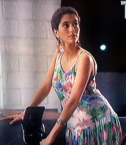 Emily is more than ready to interview romance novelist Vivica Lamoreaux (aka Lizzie Potts) in this stunning chiffon blouse, buttoned up to the top of course. Her silver cuffs bring a little playfulness to her outfit, but from the look of her hairdo, we know she means business. I know that this photo doesn’t show the bottom half of her body, but she’s wearing a pair of light wash straight-leg jeans that she will wear again several different times with totally different outfits. How thrifty!