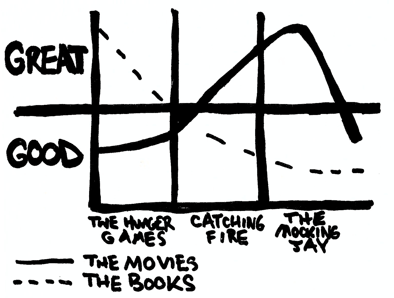 I’ve enjoyed following the Hunger Games saga, both as a series of YA novels & and as a series of dystopian sci-fi film. It’s a pretty grim franchise for something a lot of people consider “kids’ stuff”, one that takes its forcing-to-children-to-fight-to-the-death-for-entertainment premise very seriously. Its haves-vs-have-nots dystopian world-building is nothing particularly new and can especially be seen telegraphed in properties like Battle Royale & The Running Man, but I think it’s a pretty great sci-fi intro for teens, especially refreshing for its strong female protagonist Katniss Everdeen (played by Jennifer Lawrence in the films, duh) & in the way its potentially-corrosive love triangle conflict is handled. One strange aspect for me has been how the film versions of the Hunger Games trilogy have resisted the law of diminishing returns. I felt that Suzanne Collins’ novels started at their strongest point, doing a great job of establishing an in-the-moment intensity in its abysmal future-world by dragging the audience along closely with Katniss’ experience navigating the Hunger Games. The quality dropped off a bit for me in the sequels, though, as the pacing seemed to get away from Collins and large swaths of summarizing overtook the focused intimacy of early scenes. The first movie was pretty great as well, doing a good job of capturing Katniss’ in-the-moment POV, but the film series subsequently seemed to improve from there, knowing exactly what to show & what to ignore in Collins’ sprawling narrative for maximum effect.