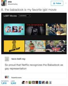 On one of our fist posts as a site, we declared The Babadook to be one of the best films of 2014, a very close second to the South Korean sci-fi epic Snowpiercer. We did not, however, have Netflix’s courage to declare that the film qualifies as LGBTQ content. It’s funny to return to Kent’s film now in search for glimpses of queerness, a context that was presumably far from anyone’s mind, Kent’s or otherwise, when it was first produced. It’s easy to make flippant jokes (and plenty have) about the Babadook’s dramatic presence in the arts (a children’s book about himself), how he’s a fancy dresser (complete with a signature top hat), how he’s kept locked away in a closet (actually, it’s a basement, but whatever), and his tendency to chat at length on the phone (about himself). If you really want to reach for something more substantive, I guess you could find interesting subtext by looking to the scene where the main character is prevented from masturbating with her ancient sex toy as an act of sexual oppression or by considering the fact that the Babadook himself is oppressed but never truly goes away as a kind of metaphorical struggle. The joke, though, is not necessarily that the film The Babadook is gay, but that its titular character is. This is still a film about a parent’s daily struggle with grief, depression, and resentment of their own child. The monstrous manifestation of that struggle, the Babadook, just happens to be a gay character within that story (according to current kayfabe, at least).