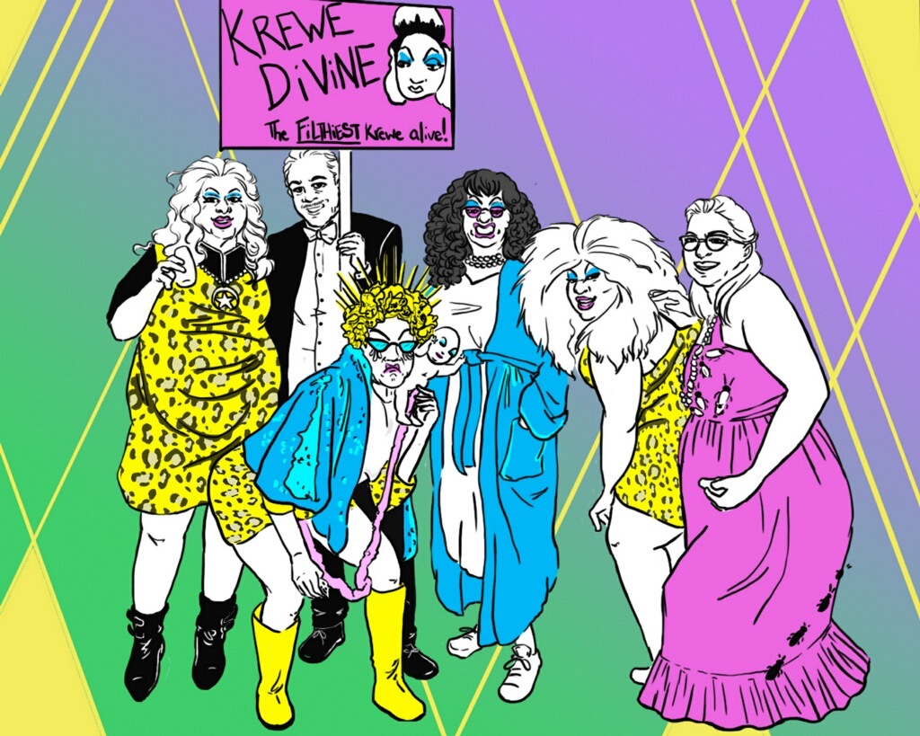 In that spirit, here’s a spotlight on two artists who could use an increase in commissions & donations in these increasingly dark helltimes. As examples of their work, I’m including portraits they’ve recently done of our Krewe Divine looks from this year and links to their personal websites where you can contact them directly. Check out their divine art, consider sending support, and let’s continue to take care of each other as best as we can.