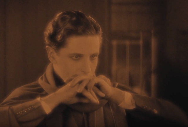 It’s never quite clear exactly what his relationship is to Daisy. Sometimes, she seems very receptive to his wooing, but at other times rejects his advances, although it’s a possible interpretation that her rejection largely occurs in scenes in which her parents are present. In their first scene together, he flirts with her by cutting a heart shape out of the dough that her mother is preparing and placing it in front of her, to which Daisy responds by tearing the heart in half and handing it back to him. To me, this established that his interest was unwelcome, but there are other scenes in which she welcomes his attention with enthusiasm. At the time of release, Joe’s actor Malcolm Keen was 40 years old, and he looks older. I’d probably attribute it to the technological limits of the time rather than to an intentional aesthetic choice, but Keen’s fair complexion and the make-up available at the time renders him, well, a bit ghastly-looking. In comparison, although Ivor Novello’s lodger character arrives at the Bunting house looking and behaving like a total weirdo, once he settles in, he reveals himself to be as beautiful as he is brooding. As a result, although I was willing to believe that the film was headed toward the revelation that the lodger was the Avenger as easily as it might have been headed toward his innocence, I also thought it might be revealed that Joe was the Avenger, but that might be my expectations being a little too close to modernity. The Avenger is apprehended entirely offscreen, his identity never revealed, but the audience of today looks at this rather small cast of characters and automatically assume that one of the characters has to be the killer. Through that lens, it could only be Joe, but that wasn’t really a trope of the medium yet.
