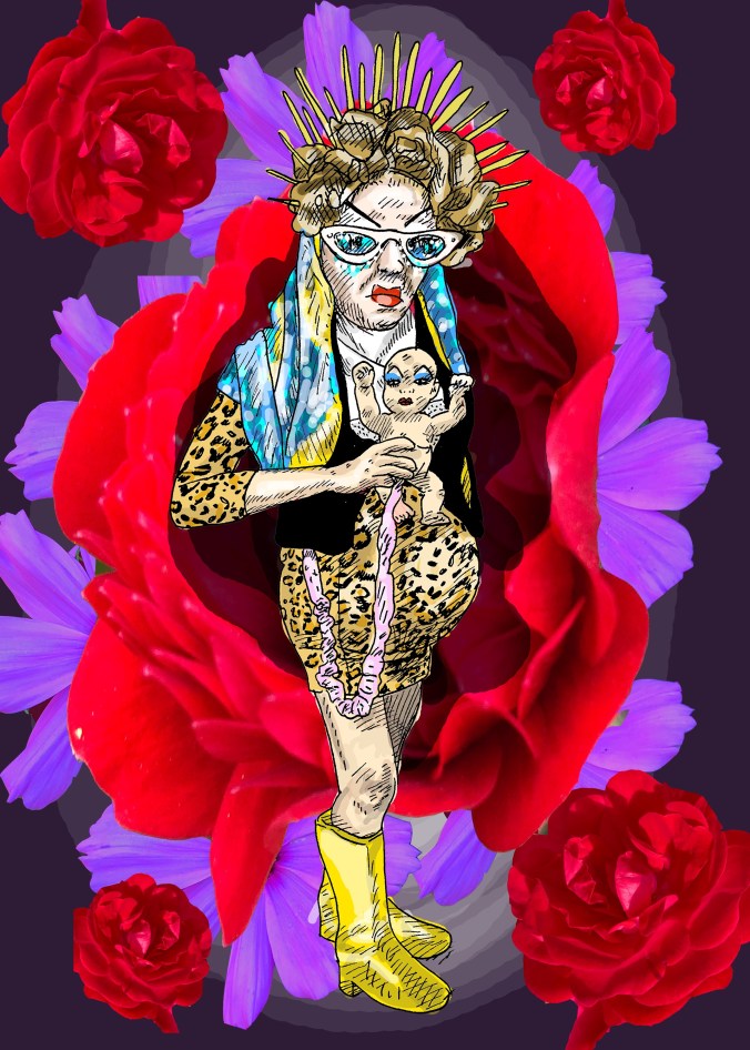 In that spirit, here’s a spotlight on two artists who could use an increase in commissions & donations in these increasingly dark helltimes. As examples of their work, I’m including portraits they’ve recently done of our Krewe Divine looks from this year and links to their personal websites where you can contact them directly. Check out their divine art, consider sending support, and let’s continue to take care of each other as best as we can.