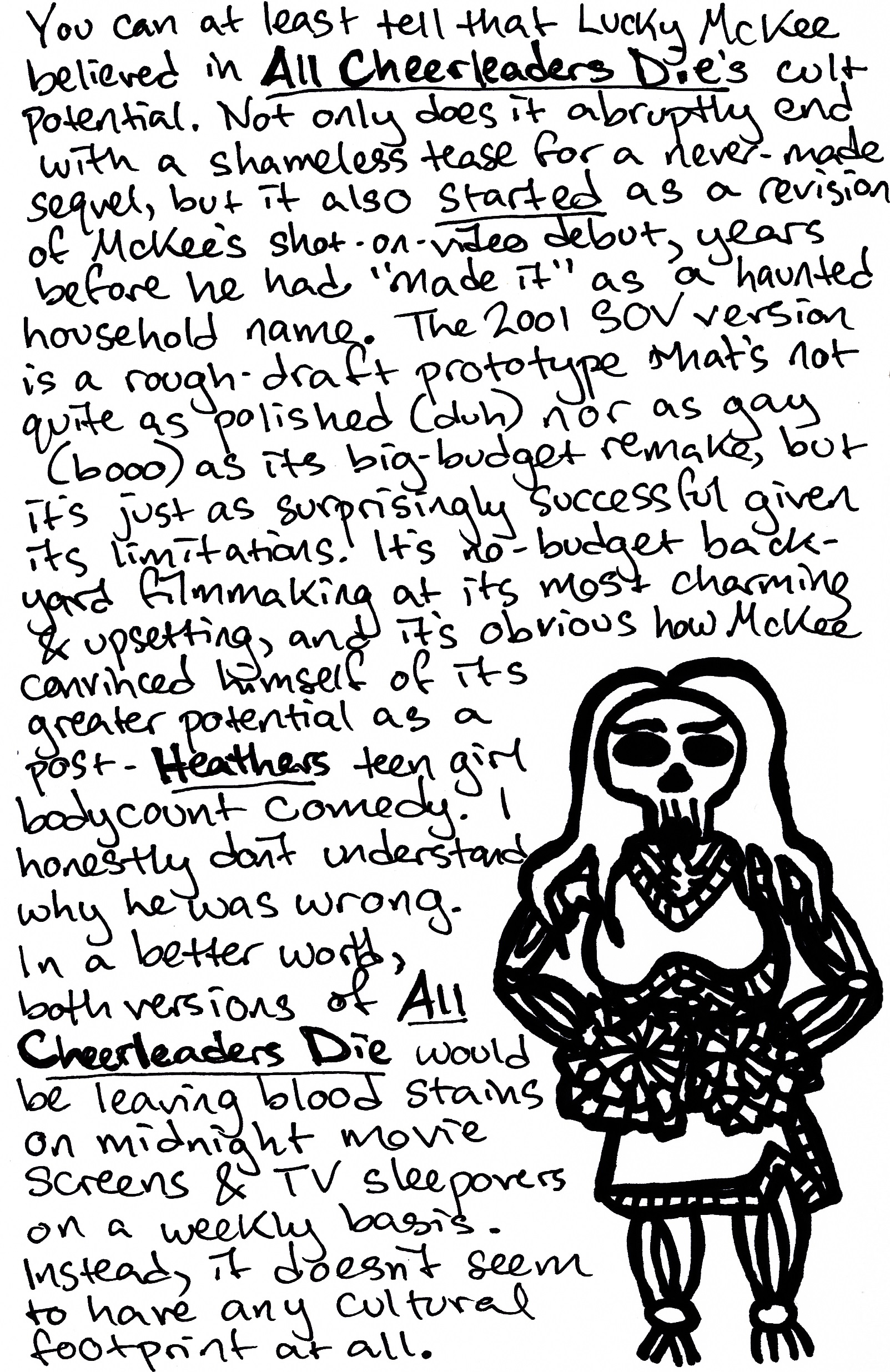 A class of Japanese high schoolers are mysteriously gassed while riding a school bus, waking on a small island wearing identical metal collars. Disoriented, they receive a crash-course orientation from a former aggrieved teacher (genre cinema heavyweight Beat Takeshi) and a kawaii pop idol, who appears only on a rolling AV Cart. The ultimate goal of the game is simple; the high schoolers must kill each other within 72 hours until only one survivor is left. The rules of how to accomplish that goal get a little trickier, involving explosive collars to punish conscientious objectors, volunteer players who appear to be violent gangsters from outside the class, rotating areas of the map that are temporarily forbidden to discourage stationary hiding, etc. The singular weapon that each student is provided varies wildly in effectiveness, ranging from knife to gun to binoculars to pot lid. That arbitrarily assigned hierarchy and the rules of combat appear designed entirely to keep the game moving & entertaining, as if the film were being broadcast on national Japanese television instead of closed-circuit security monitors. Every kill is even punctuated with an onscreen rolling body count that feels as if it were made for a live-feed audience, not the dweebs in the theater. That one change in broadcast scope might be the only place that later works like The Hunger Games might’ve improved on the Battle Royale premise, even if they pulled that detail from Stephen King novels like The Long Walk & The Running Man. The most Battle Royale touches on the entertainment media of its time is during the AV-cart orientation scene, in which a cutesy pop idol directs her audience to log onto http://www.br.com.