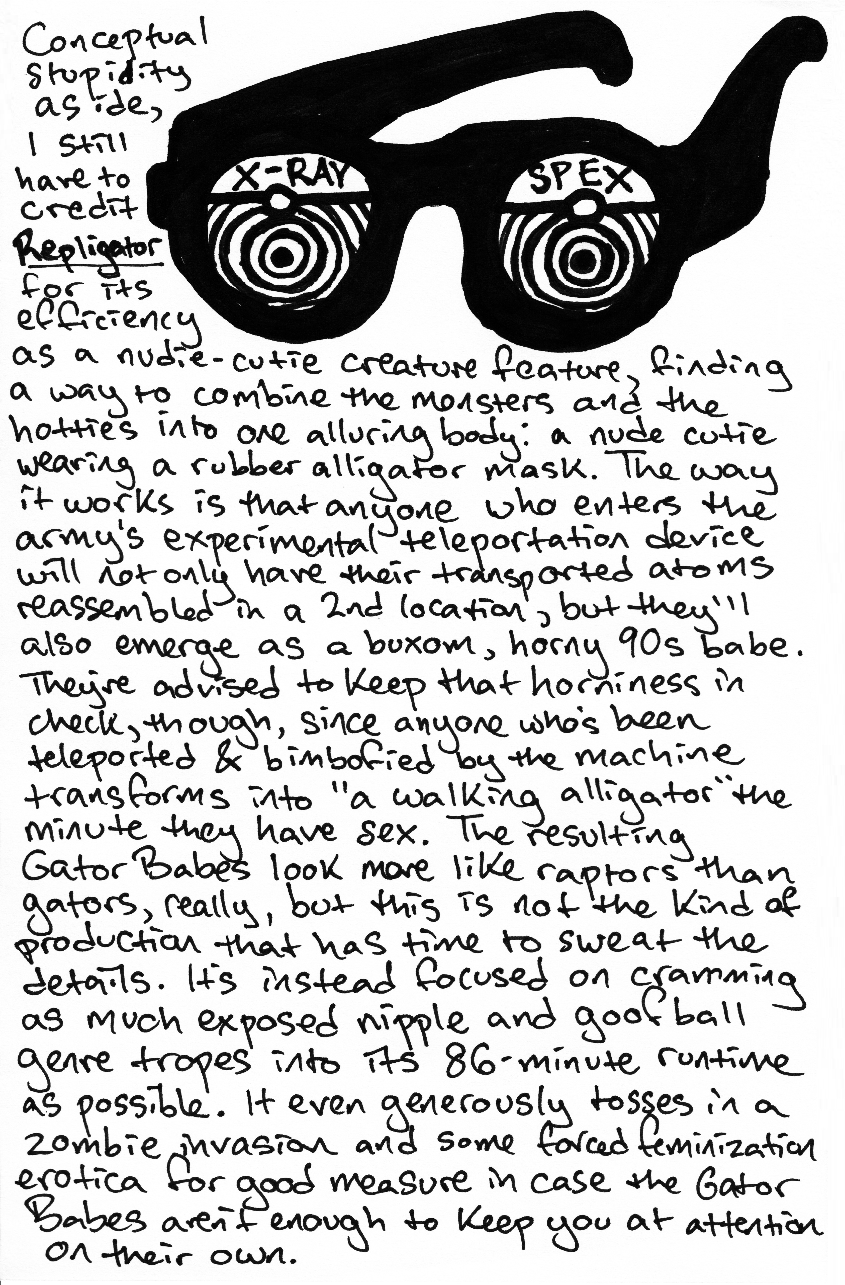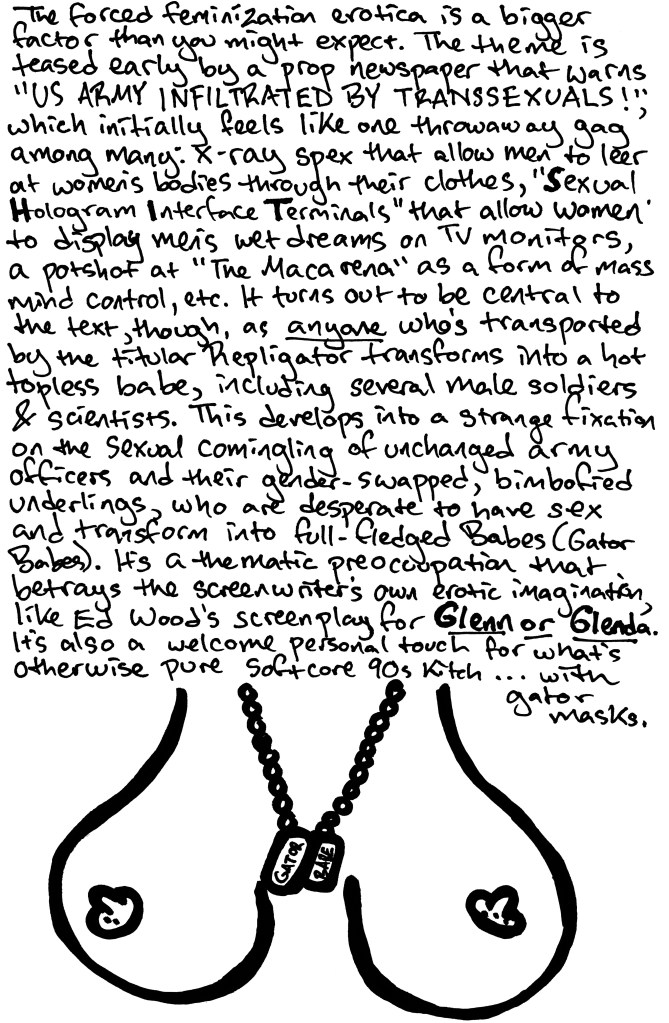 Even beyond the absurd anachronism of brining the nudie cutie into the VHS era and the jarring frugality of Wishman pilfering her own back catalog, Dildo Heaven has plenty of minor quirks & gags that keep it entertaining as a lost trash relic throughout: winking fantasies where a man sprouts a second boner to facilitate a threesome, go-nowhere montages of girls idly hanging out on playground equipment while incongruous thriller music sets an ominous tone, a movie-length gag about the world’s cheapest wig, etc. Best of all, it’s readily apparent that Wishman was having fun while filming this unrepentant trash, enjoying her late-career celebrity as “The Female Ed Wood.” She allows herself a Hitchcockian cameo where she practically winks at the camera as she strolls by, directs a character to exclaim “What a cool magazine!” while flipping through an issue of Psychotronic Video, and even promoted the film on a legendarily bizarre episode of Late Night with Conan O’Brien where she got to tease Roger Ebert for his boyish crush on Chesty Morgan. The best quality of the nudie cutie as a genre was that it was having lighthearted, knowingly campy fun with the idea of erotic titillation (a welcome contrast to the dark days of the roughies that followed). While the genre may have been long-obsolete by the time Wishman made Dildo Heaven, the novelty of that kind of playful, weirdly innocent erotica is eternal.