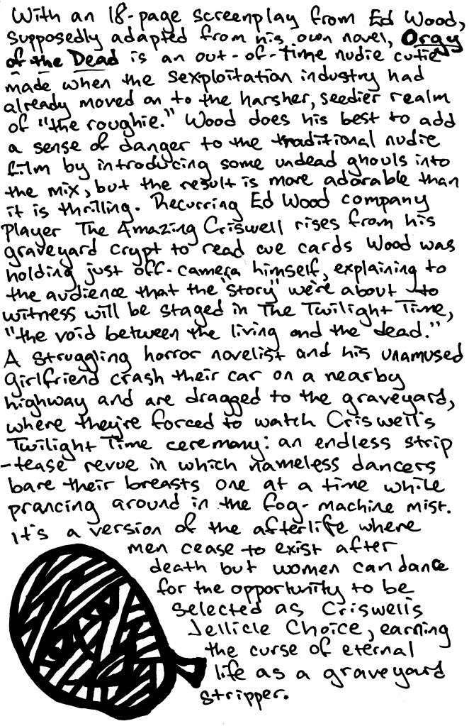 A document of stripping-fashions past, Naughty New Orleans is a vintage Bourbon Street striptease revue set to somber jazz and routinely interrupted by hack comedy routines & whispers of a plot. Set inside the “Ain’t dere no more” Bourbon Street club The Moulin Rouge, the core of the film is a series of burlesque acts akin to what I’ve seen performed in more recent years at The AllWays and One Eyed Jacks. Occasionally, a dancer will perform a superheroic feat like simultaneously helicoptering four independent tassels on her bra & panties in opposing directions, but mostly they just put on and take off their gartered stockings one leg at a time, just like everybody else. If you can ignore the heavily laugh-tracked, light-on-actual-laughs comedy sketches that interrupt those dance routines, it’s a warmly pleasant, classically smutty good time.