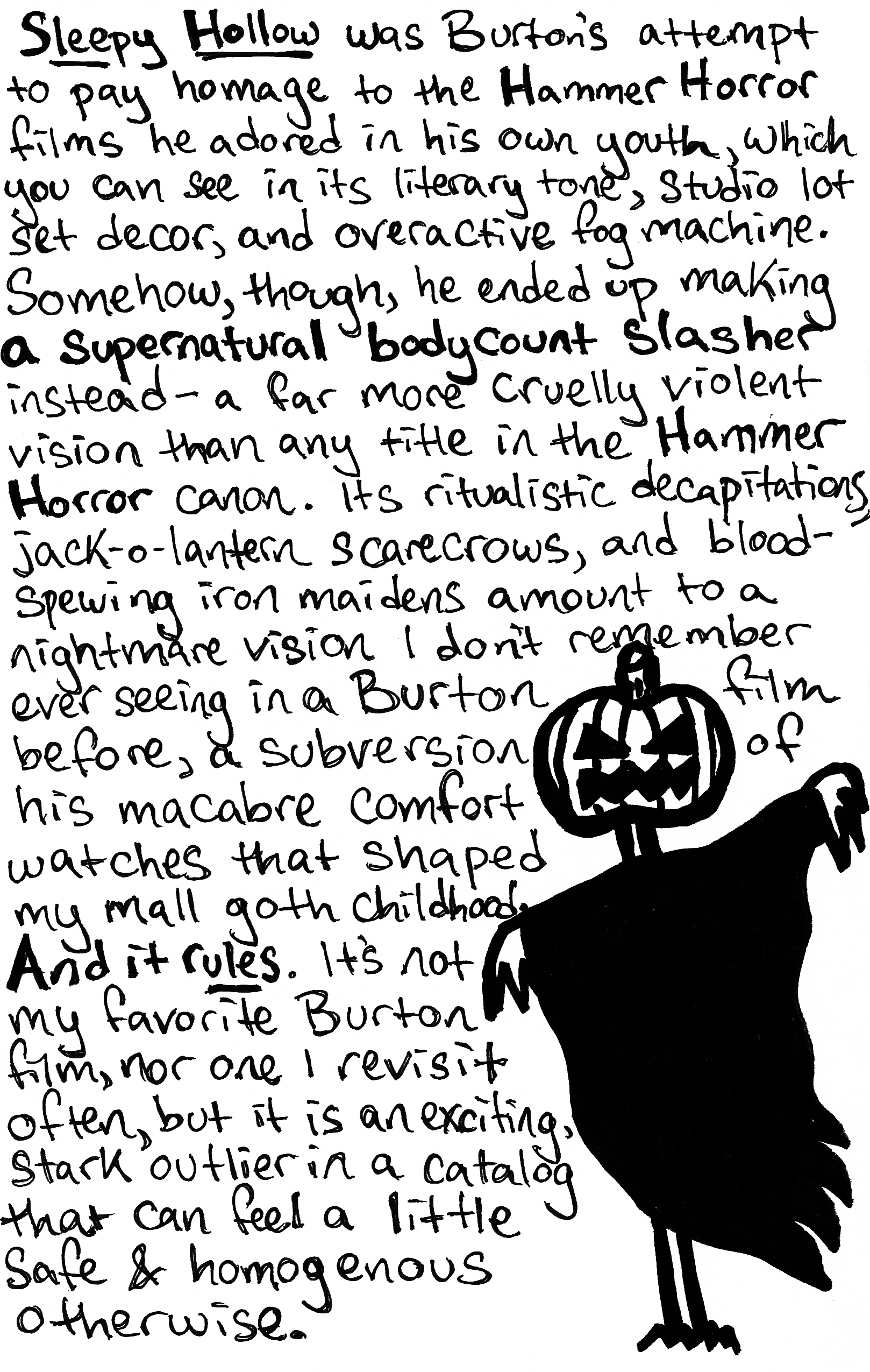 I was drawn to Kill-O-Rama’s 20th-anniversary screenings of Tim Burton’s stop-motion musical Corpse Bride for a few reasons, not least of all because it felt like a rarer anomaly in the schedule than more frequent go-tos like The Exorcist & Bride of Frankenstein. That’s assumedly because it’s a lesser loved title among the rest of the heavy hitters on the schedule, despite it being a perfectly charming seasonal novelty. When it was first released, Corpse Bride was treated like the microwaved leftovers from earlier Tim Burton/Henry Selick productions like The Nightmare Before Christmas & James and the Giant Peach, but 20 years later it now plays like a precursor for later Laika productions like ParaNorman & Coraline, which have since become the go-to primers for lifelong horror nerd obsession among youngsters. Time has mostly been kind to it, give or take the biggest star in its voice cast (the wine-tasting spit bucket Johnny Depp), but I’ve personally always had a soft spot for it. It’s hard not to adore a movie that fantasy-casts Peter Lorre as a talking brain maggot with kissable lips and takes breaks from advancing its plot to animate a band of stop-motion skeletons playing saxobones against Mario Bava crosslighting. I missed the film during its initial theatrical run, though, so I had only ever seen it on a 2nd-hand DVD copy, which made this repertory screening a must-attend event.