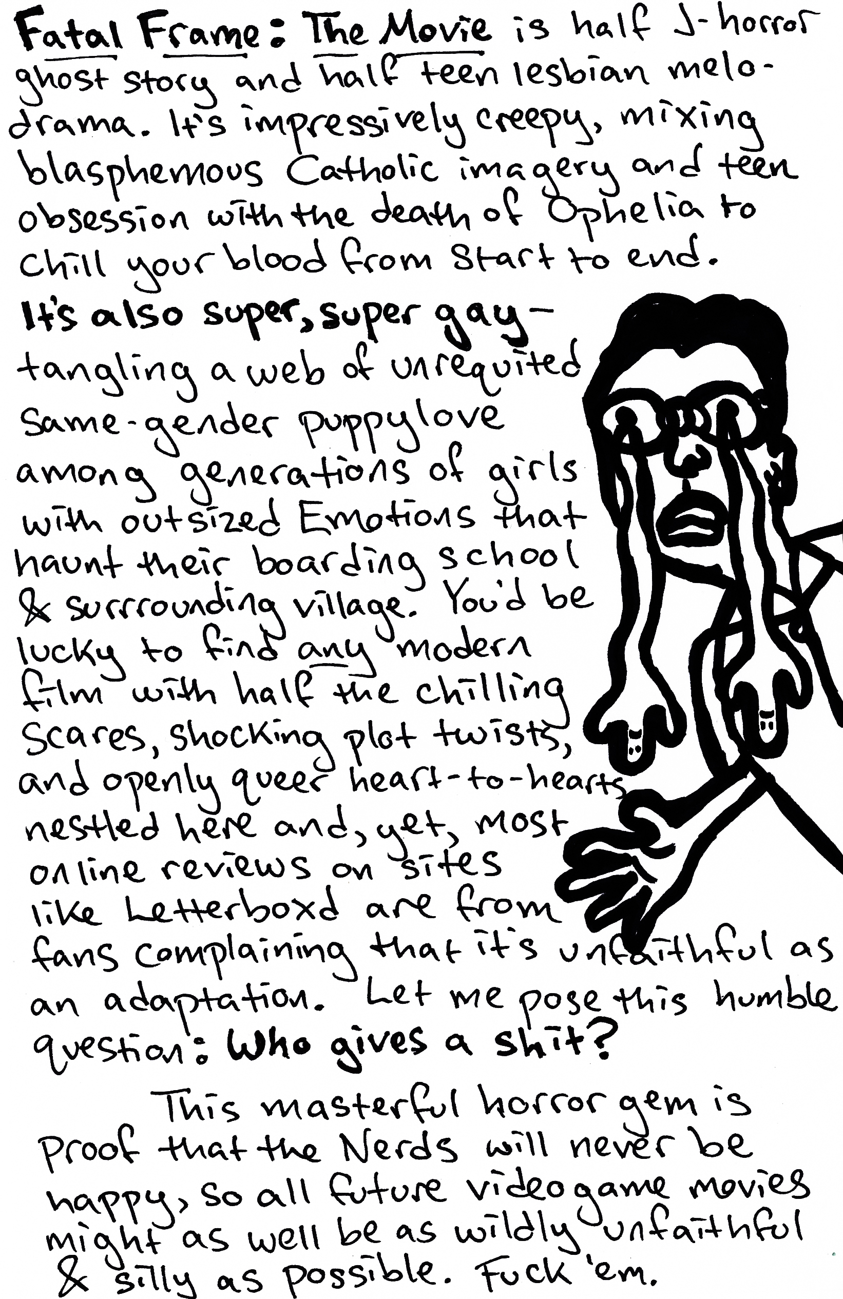 In terms of its mind-melting, genre-defying maximalism, there are a ton of psychedelic Japanese freak-outs I’d compare We Are Little Zombies to before citing Scott Pilgrim vs. the World: Suicide Club, Hausu, Funeral Parade of Roses, Wild Zero, etc. Still, the two films’ overlap of pop punk soundtrack cues, twee heartbreak, and video game surface aesthetics make the comparison unignorable. We Are Little Zombies amplifies the little touches that make Scott Pilgrim charming into an explosively entertaining video game dreamscape that much more clearly, consistently registers as Something Special to my eyes. It’s apparently now my turn to overhype an underseen, underloved video game fantasy piece until people are sick of hearing about how great it is. Hopefully, I’ve got at least a decade until the tides turn against it.