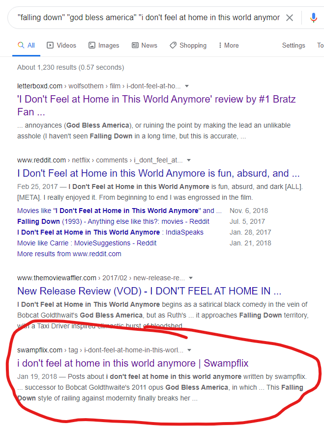 Boomer: I tried to see if there was a more concise term than “Falling Down/God Bless America/I Don’t Feel At Home in this World Anymore/Spree territory,” since they’re all “revenge” films of a kind, but that terminology calls to mind Dirty Harry and Death Wish, which are much more macho and gross than what I’m thinking about. This led me to try Letterboxd for the first time to see if I could look for lists which have those films in common, but I didn’t have any luck. In fact, if you Google those film titles in quotation to see if anyone else is exploring those films in conversation with one another, Swampflix is the fourth example. I guess that means it falls to us to name it, and I propose we call it “Match Factory Girl on the Verge.”